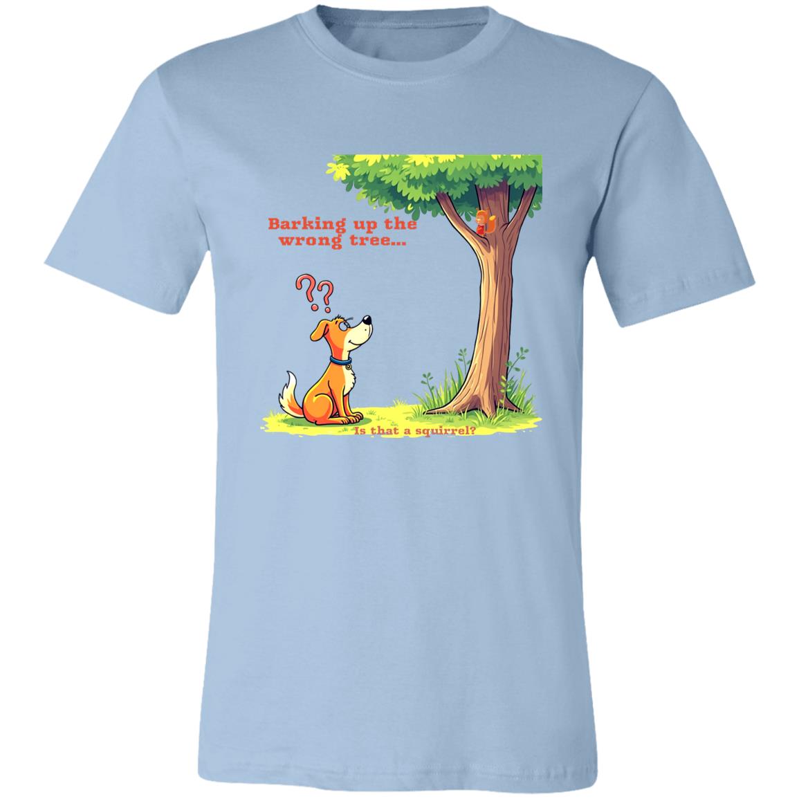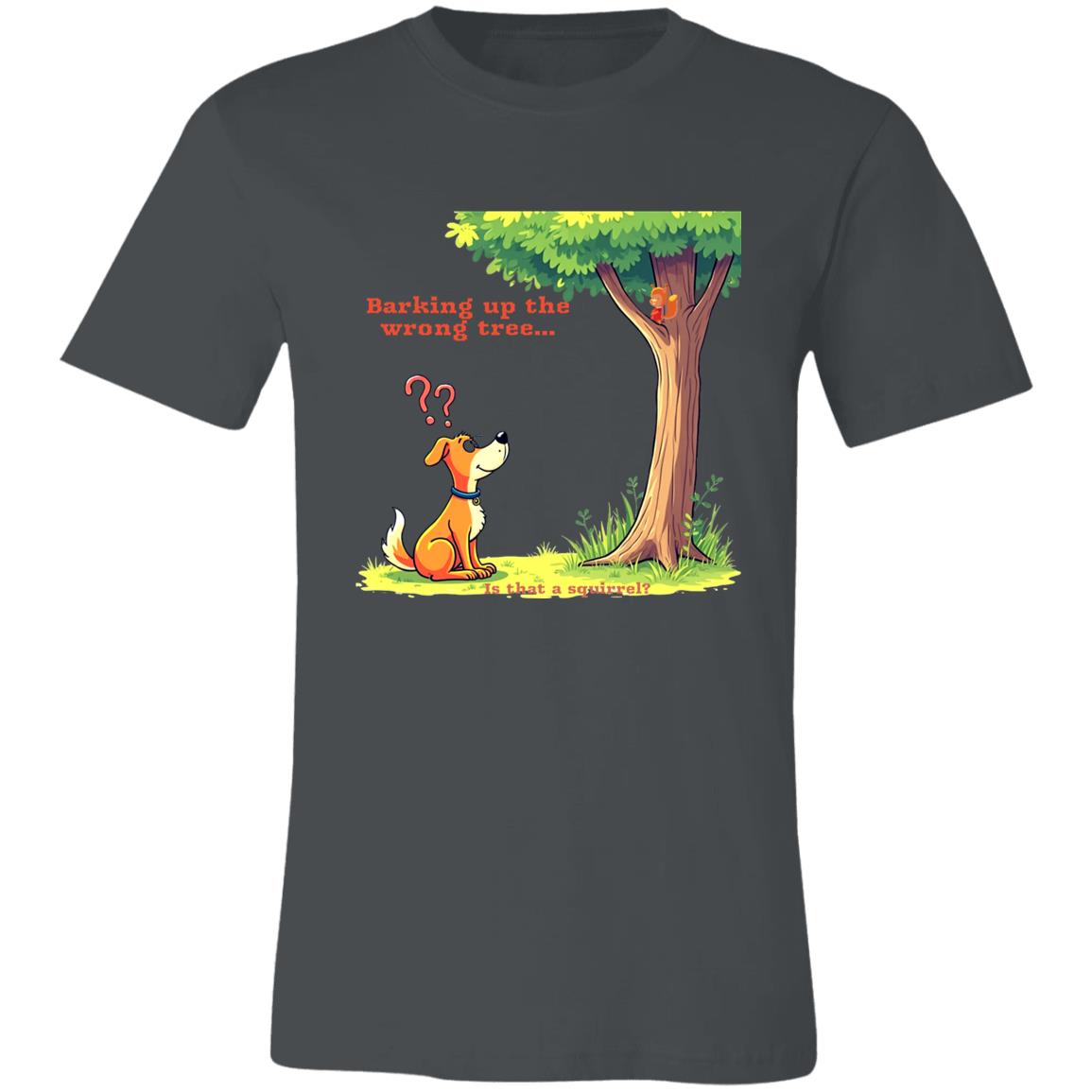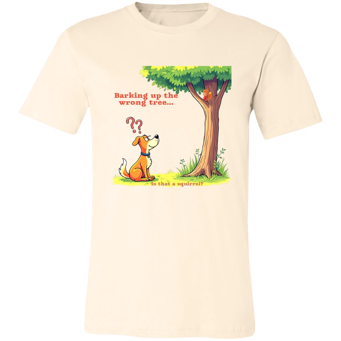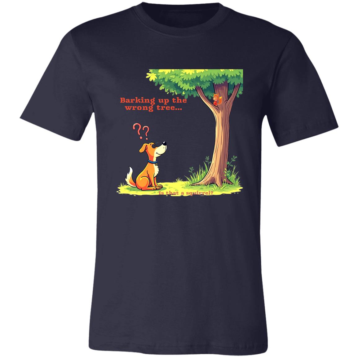 Playful, cozy, and made for dog lovers. This unisex graphic T-shirt features a curious pup gazing up a tree at a sneaky squirrel with the caption “Barking up the wrong tree… Is that a squirrel?” Printed in crisp, vibrant color on a soft, everyday tee, it’s an easy conversation starter for walks, weekends, and anyone who knows the sound of a squirrel alert.