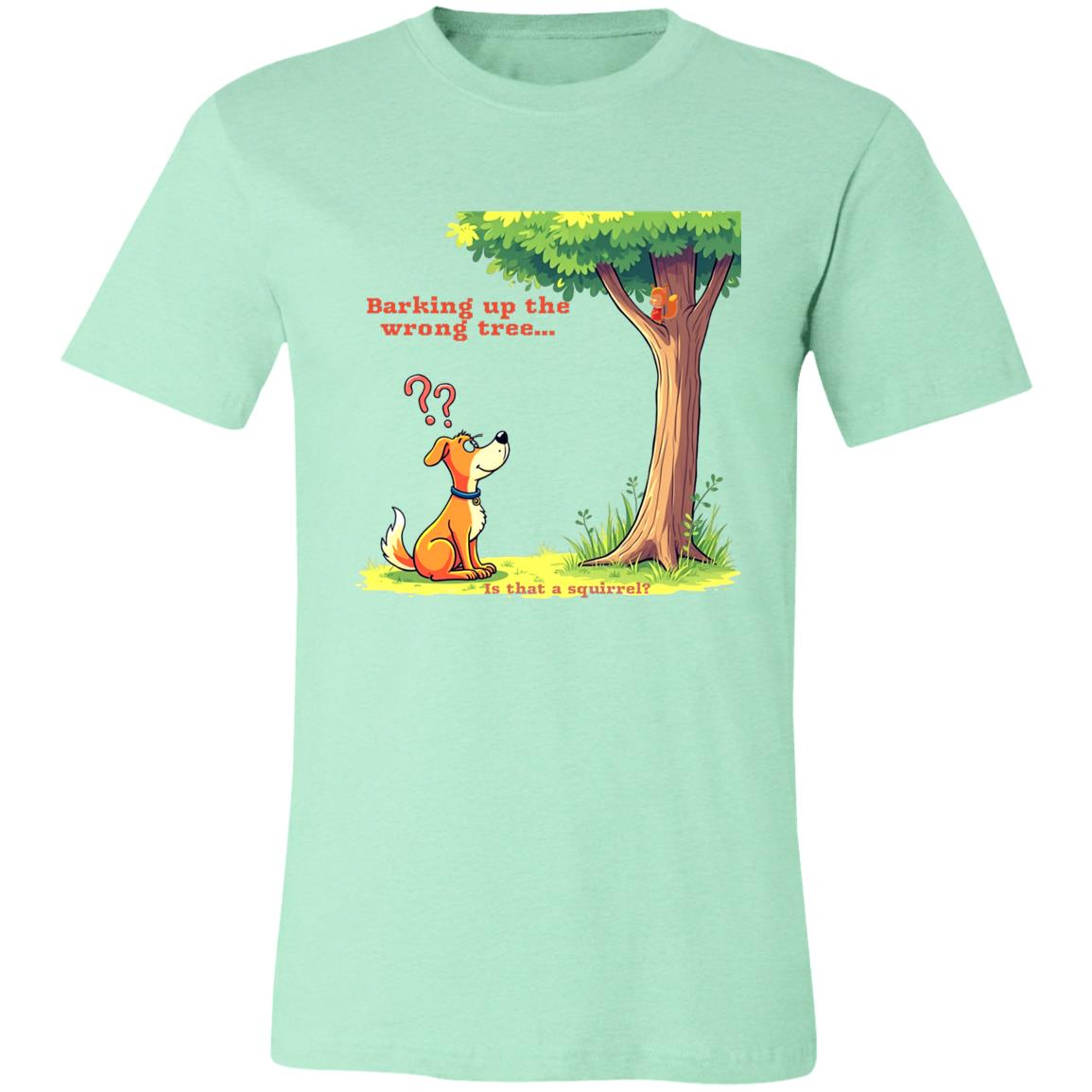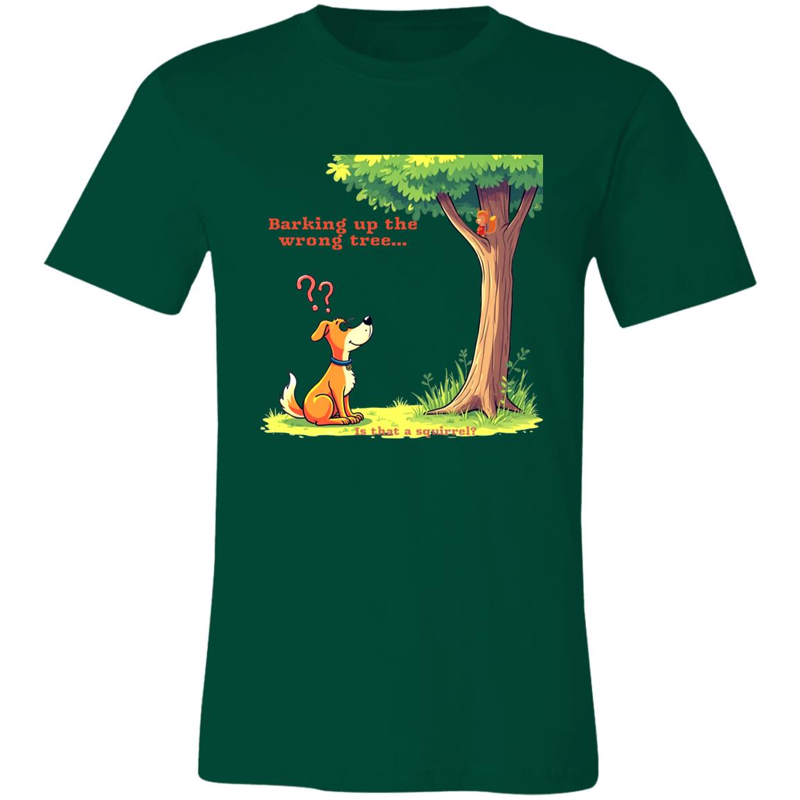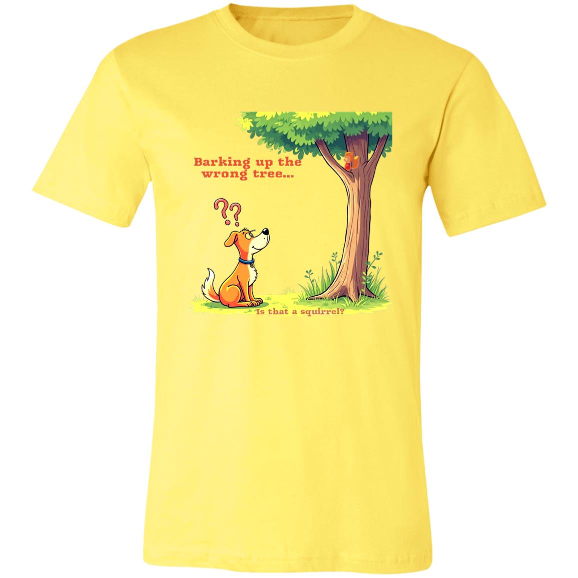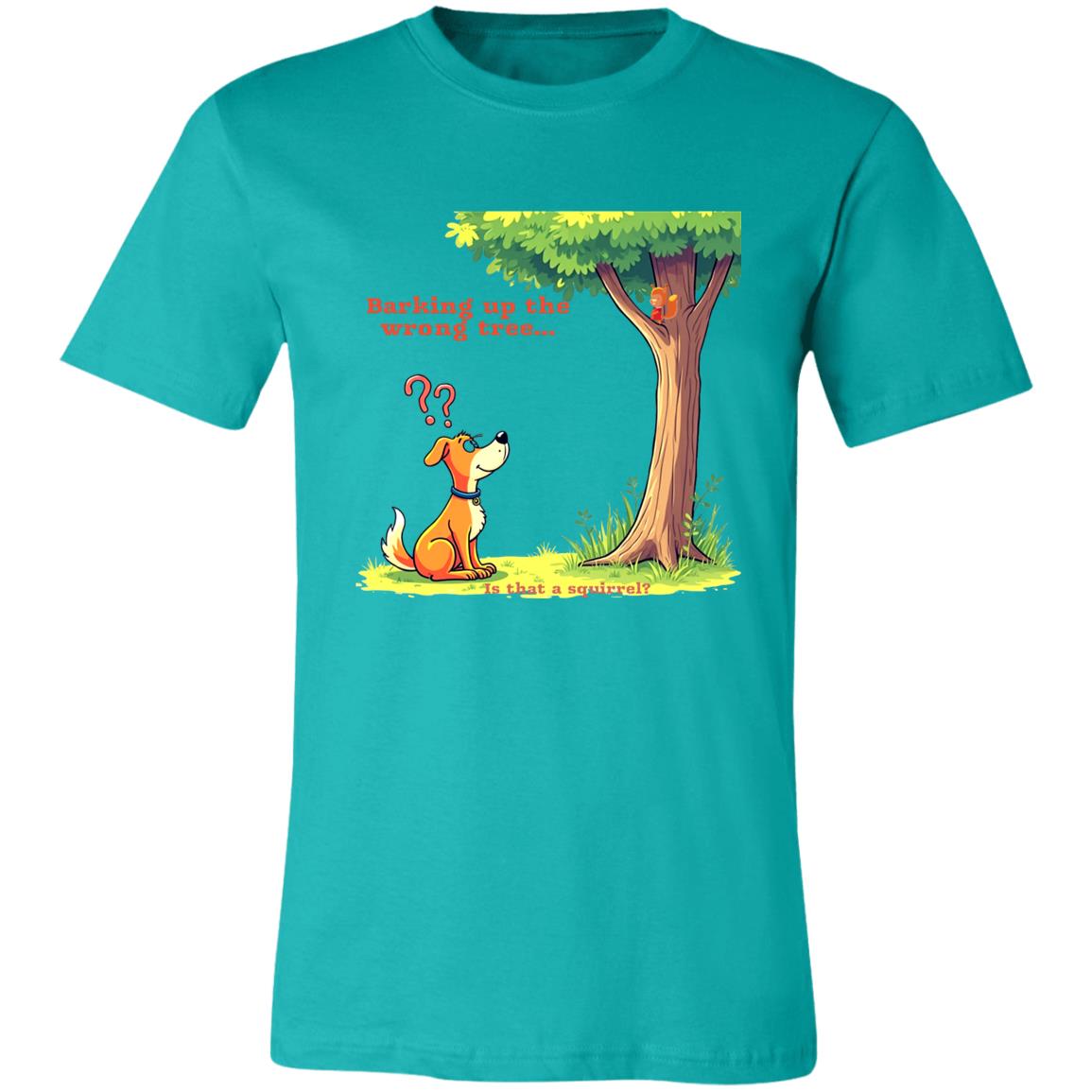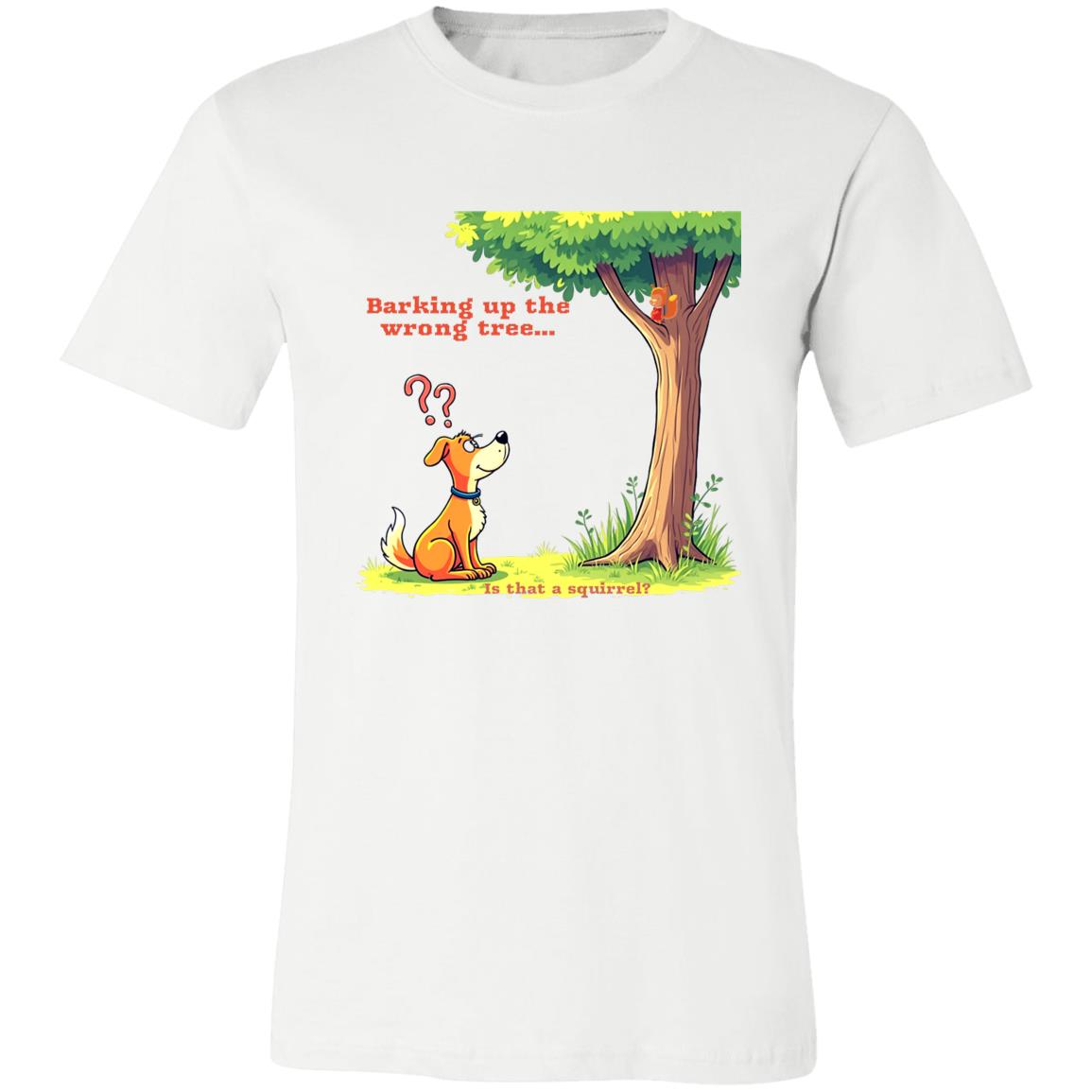 Playful, cozy, and made for dog lovers. This unisex graphic T-shirt features a curious pup gazing up a tree at a sneaky squirrel with the caption “Barking up the wrong tree… Is that a squirrel?” Printed in crisp, vibrant color on a soft, everyday tee, it’s an easy conversation starter for walks, weekends, and anyone who knows the sound of a squirrel alert.