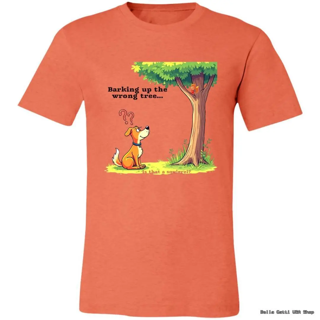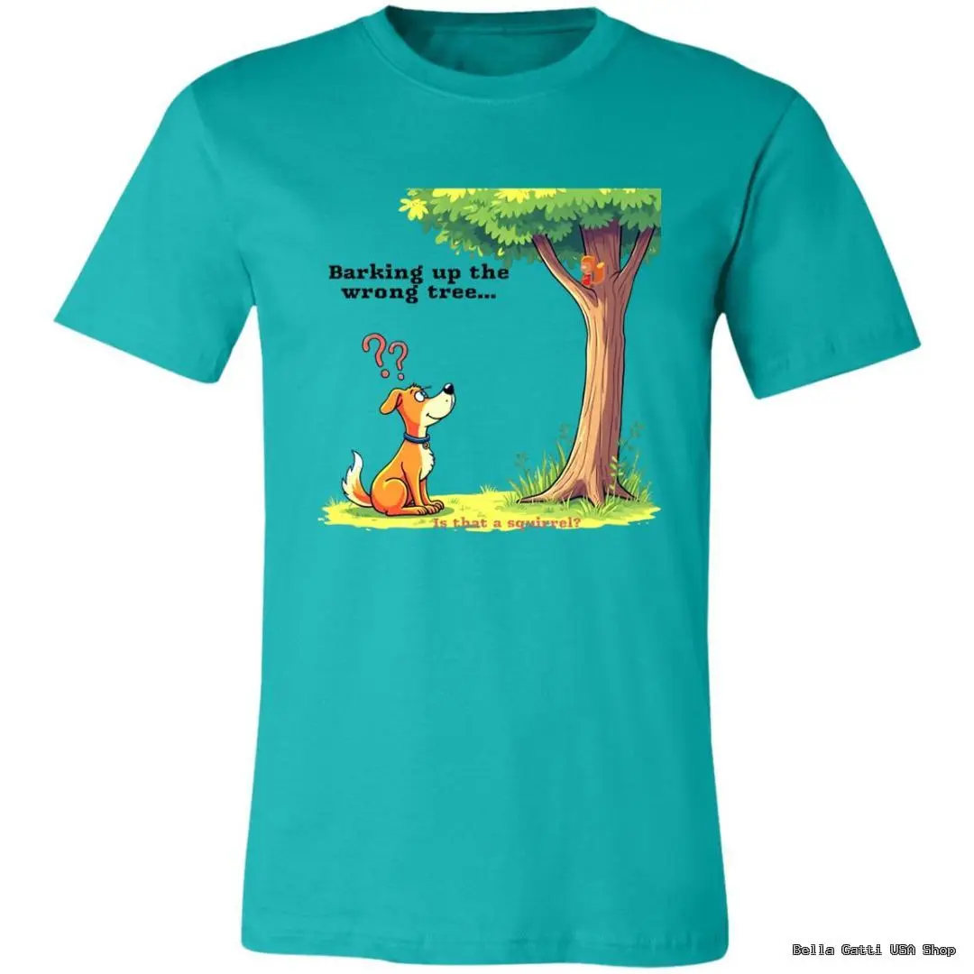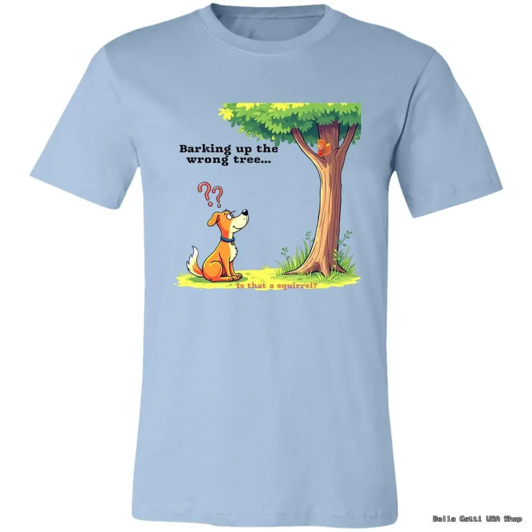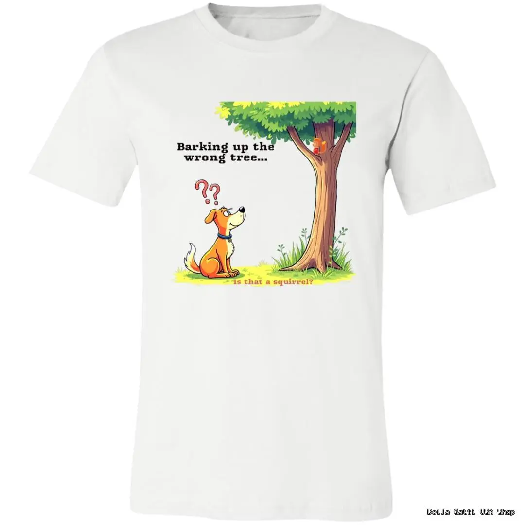 A soft, everyday tee featuring a cheerful cartoon dog puzzling over a squirrel in a tree with the caption “Barking up the wrong tree…”. Playful, pun-loving, and perfect for dog people, this shirt delivers a bright, durable print on a comfortable, classic fit that works for any casual day out, walks at the park, or gifting to your favorite pet parent.