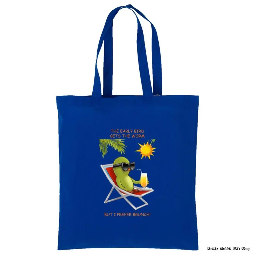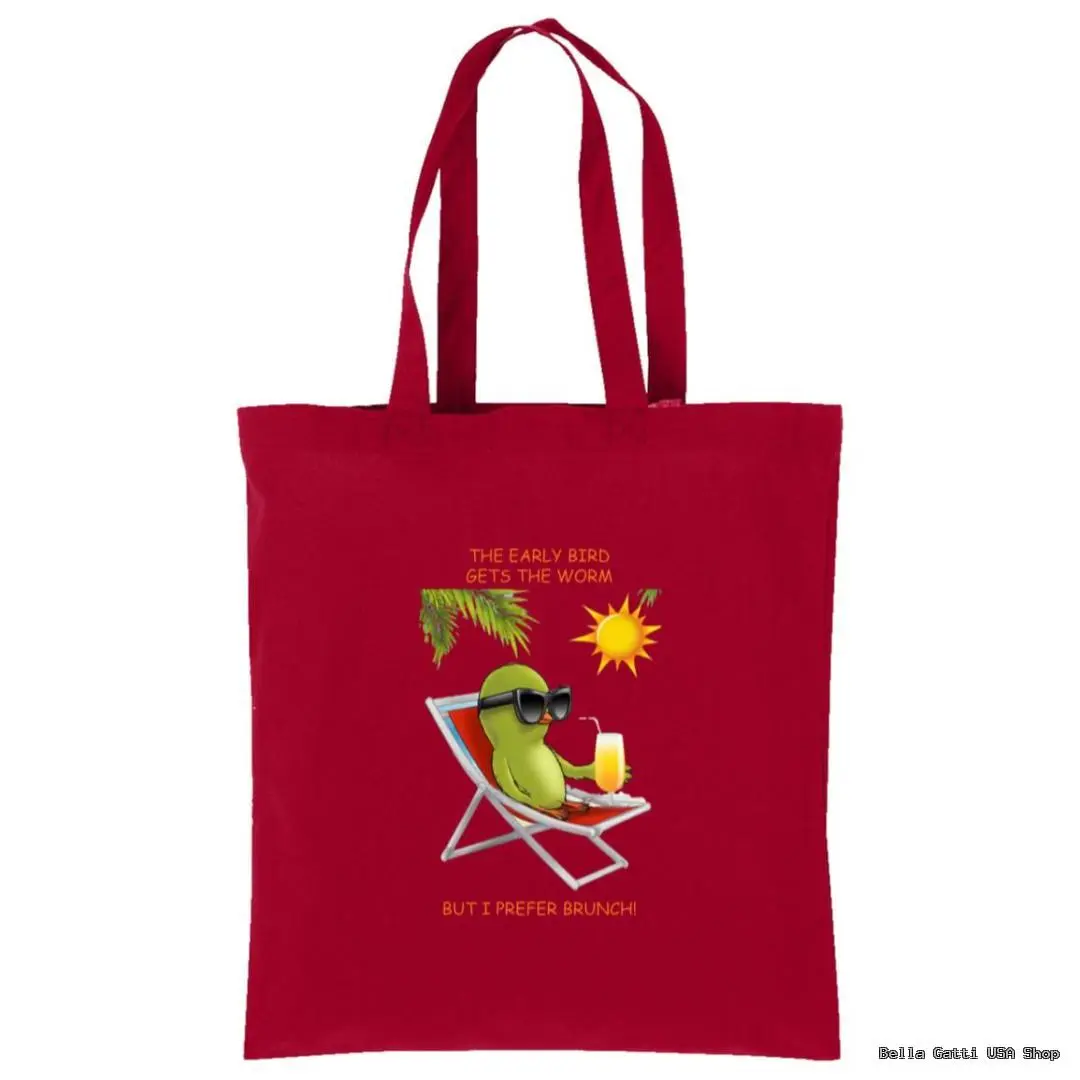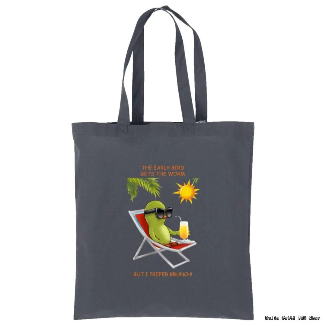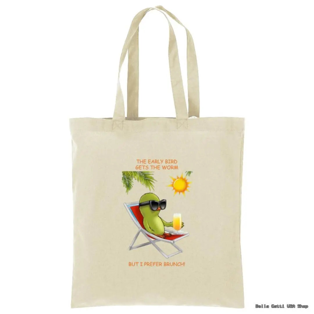 Bring chill brunch vibes wherever you go with this playful cotton tote. The front features a relaxed, sunglasses-clad bird lounging with a drink and the cheeky line: “The early bird gets the worm… but I prefer brunch!” Made from 100% cotton, this everyday bag is soft, sturdy, and ready for errands, beach days, campus, or the farmer’s market.