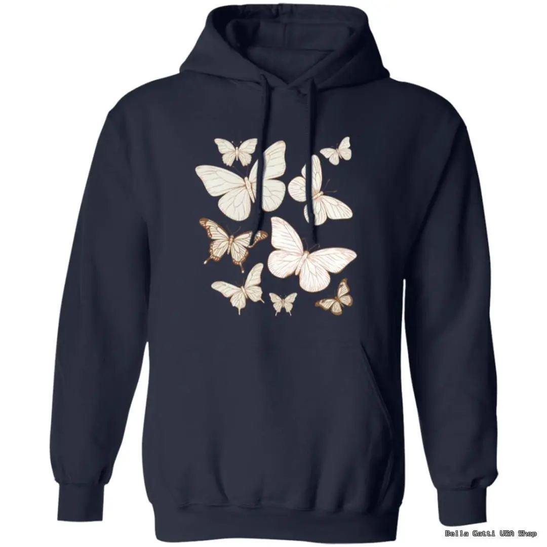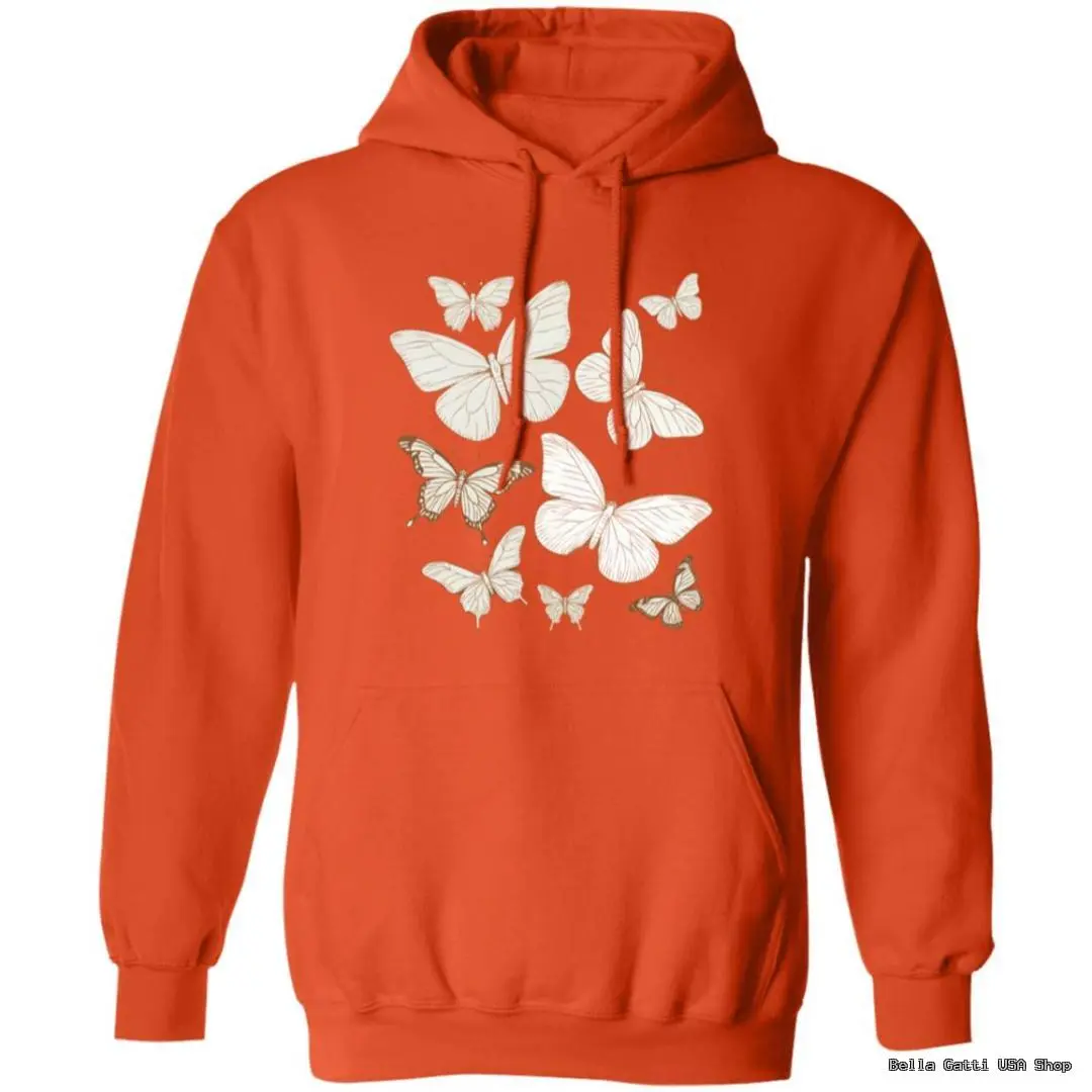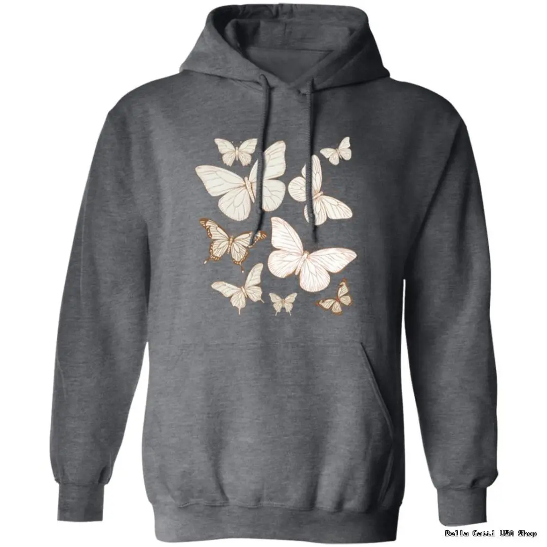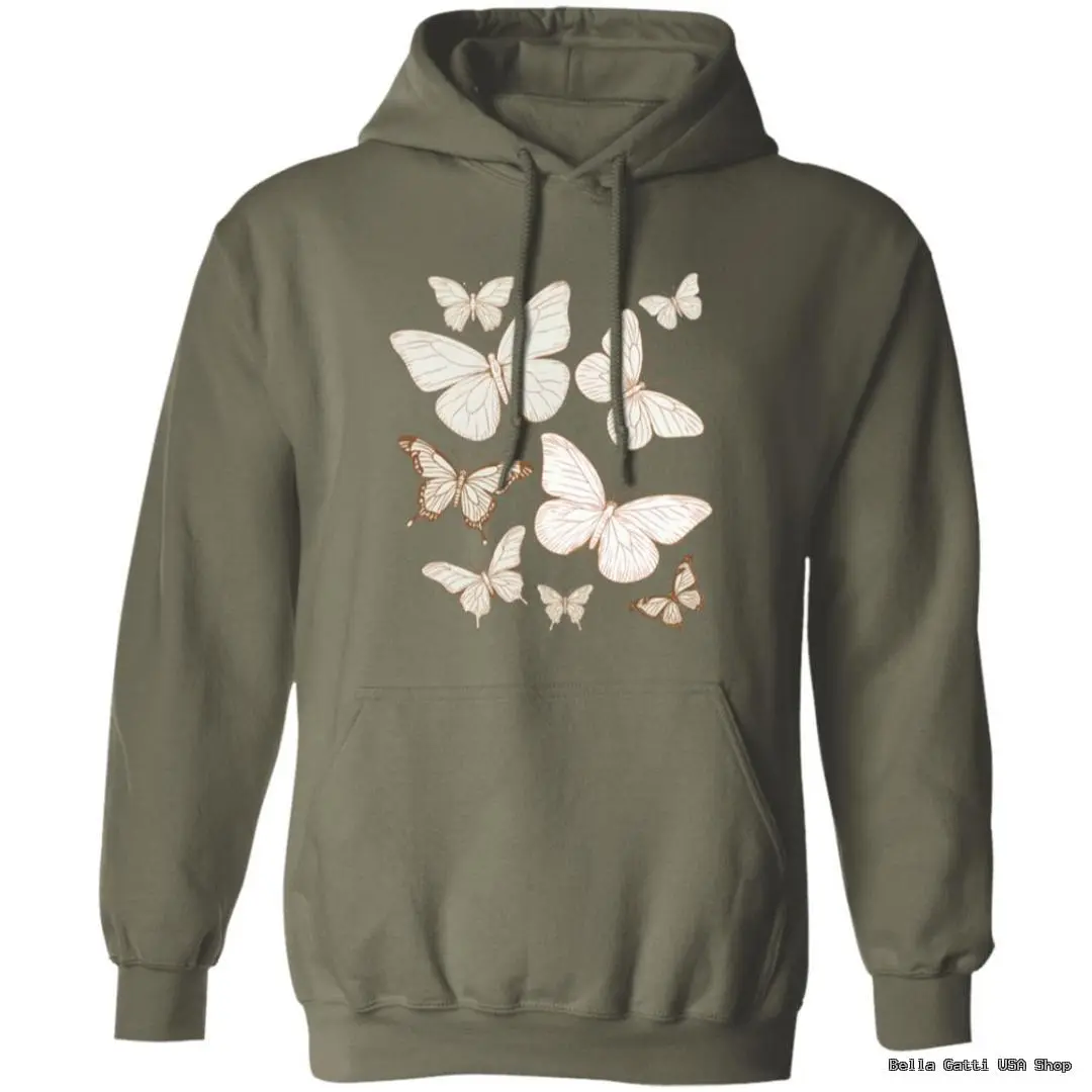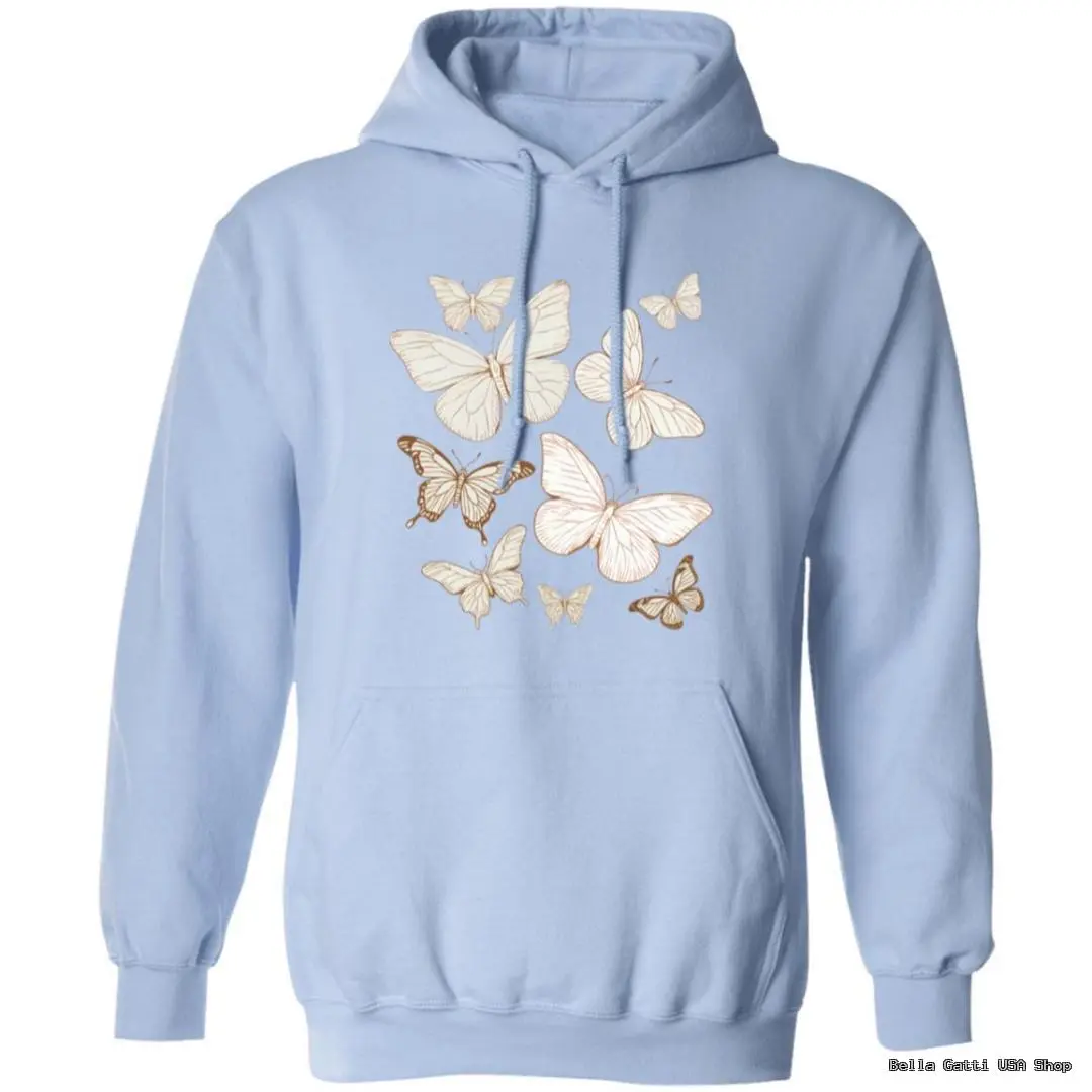 Soft, midweight butterfly hoodie with unisex fit, kangaroo pocket and adjustable hood. Pick from sand, black, white, sage, gray, navy. Sizes S–2XL.