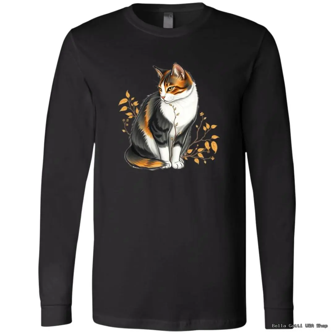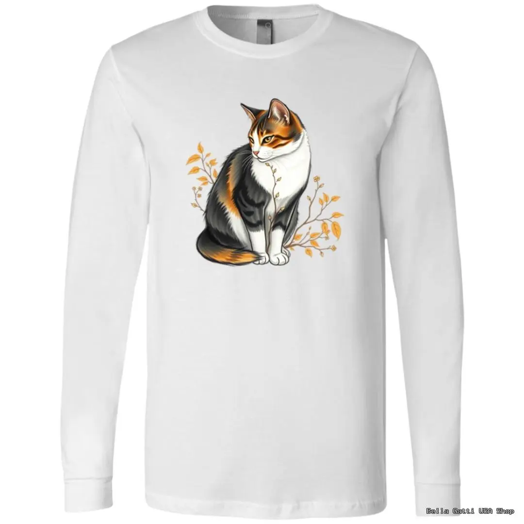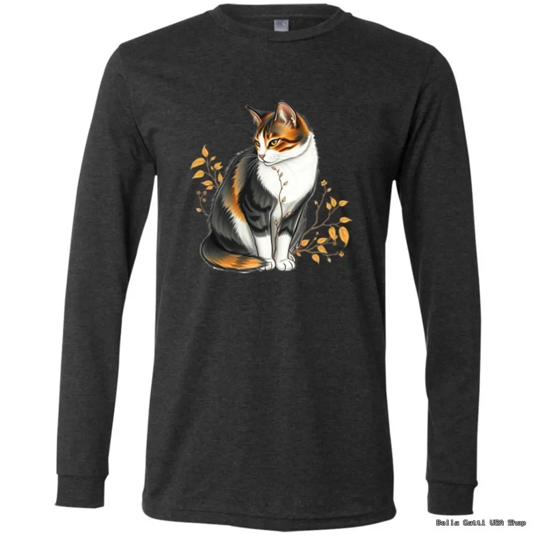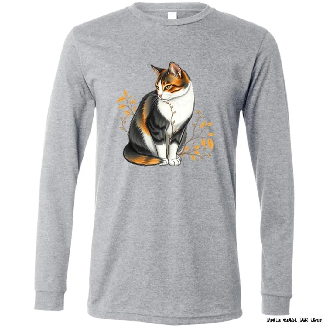 Calico Cat and Autumn Leaves Unisex Long Sleeve T-Shirt – Soft Ring-Spun Cotton, Cozy Everyday Layer.