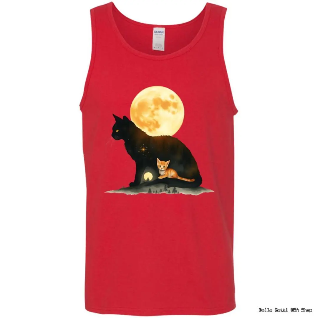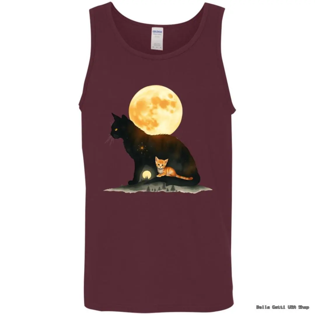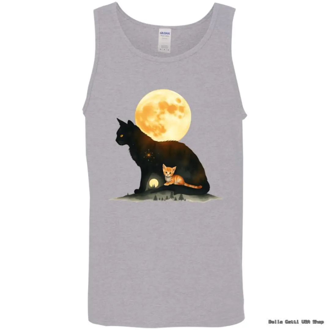 Moonlit black cat and kitten graphic tank top with ultra-smooth DIGISOFT print. Soft, breathable, unisex fit. Multiple colors. Sizes S–2XL.