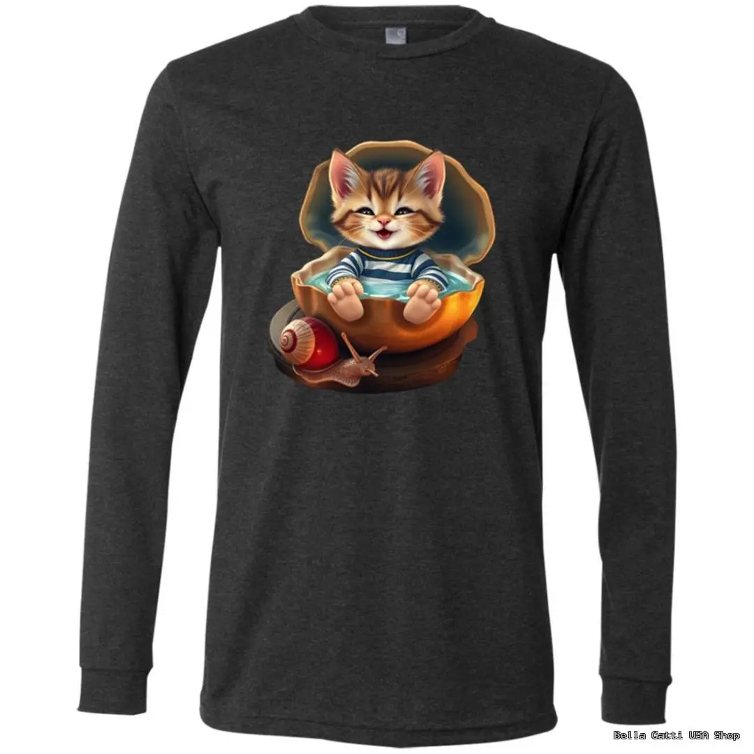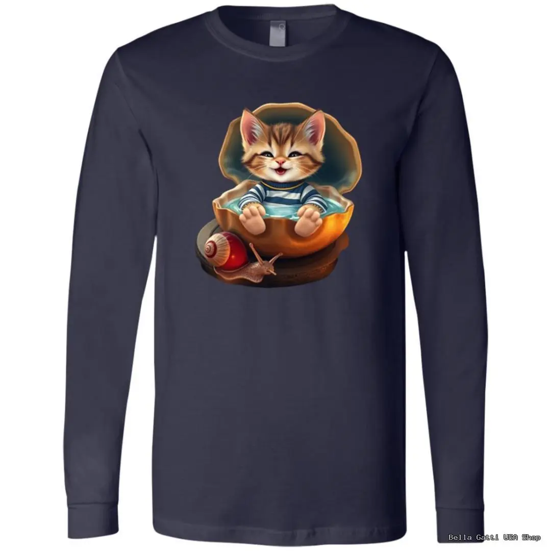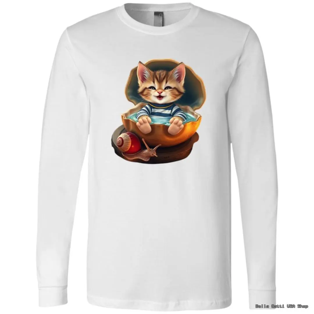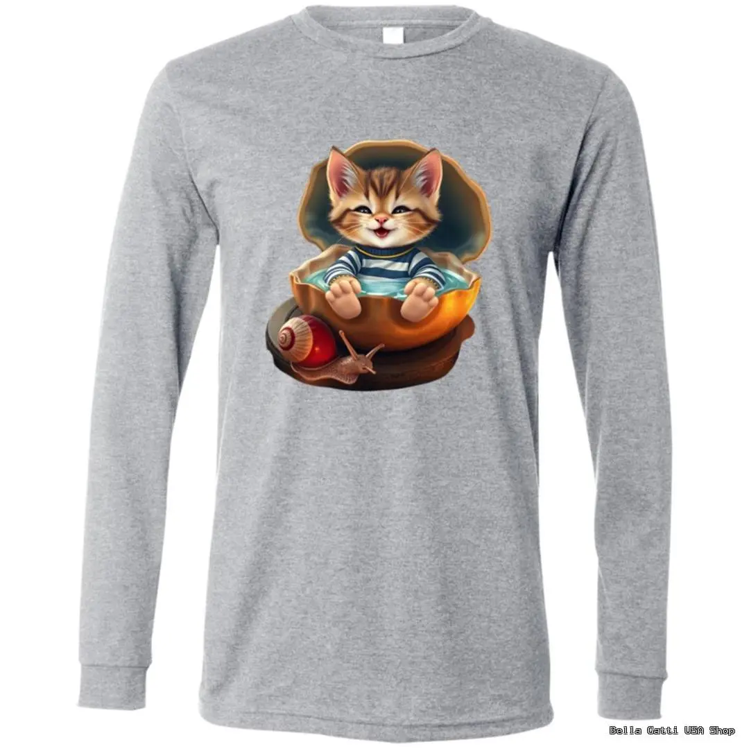 Meet your new cozy favorite. This unisex long sleeve tee features a whimsical illustration of a smiling sailor kitten relaxing inside a golden shell with a tiny snail companion. Soft, breathable fabric and a classic fit make it perfect for layering or wearing on its own—great for cat lovers and anyone who enjoys playful art.
