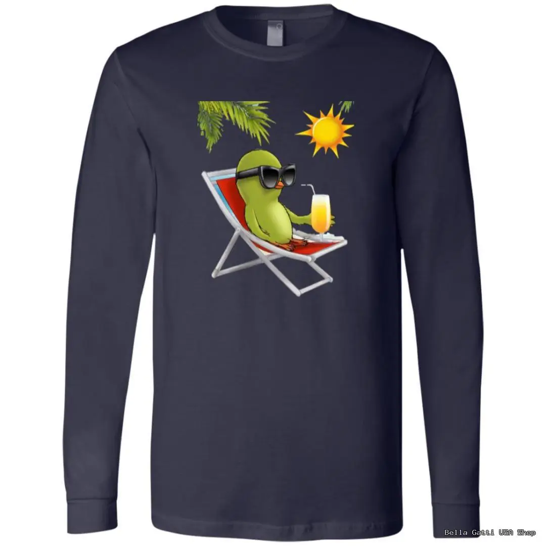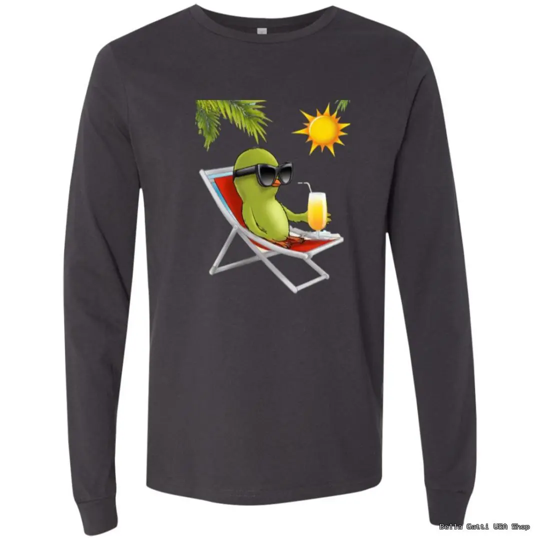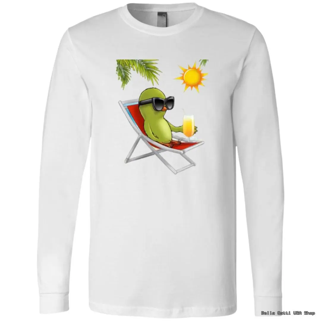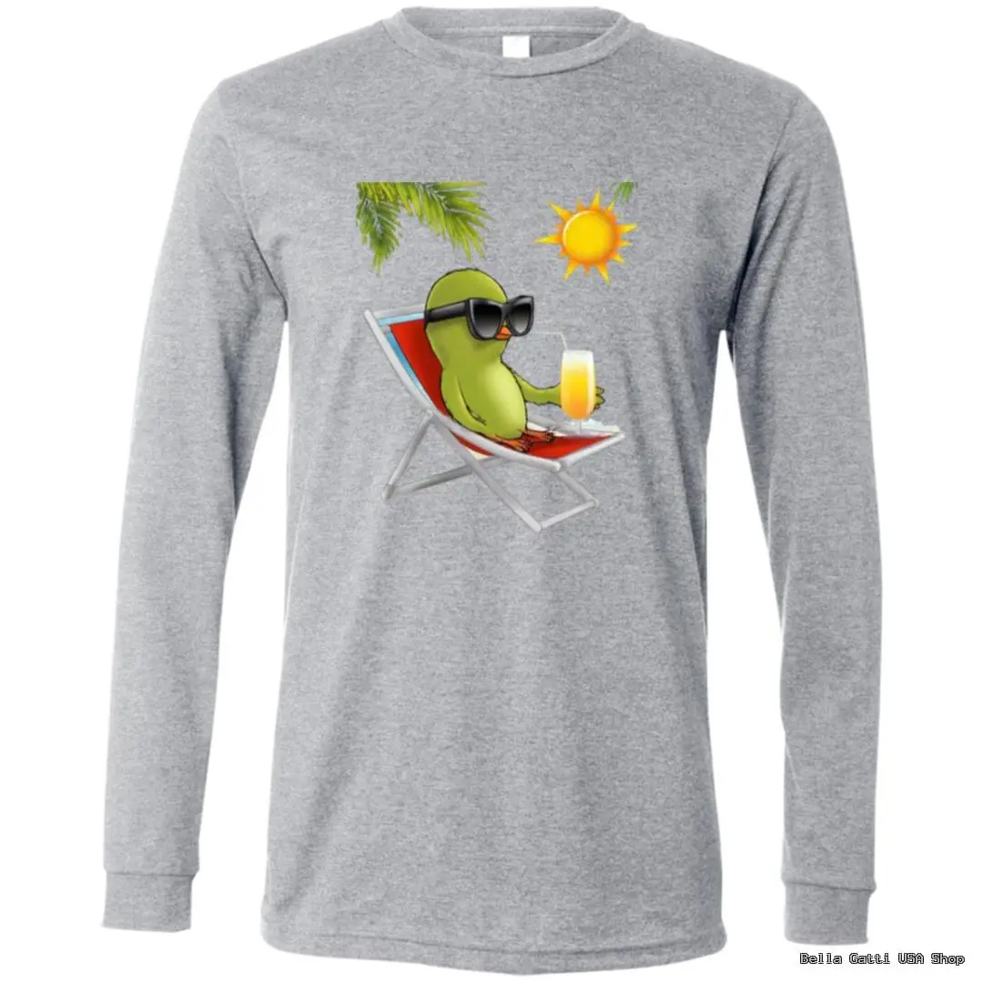Kick back in style with this playful long sleeve tee featuring a chill green bird lounging in a beach chair, rocking oversized shades and sipping a sunny drink under palm fronds. Soft, breathable fabric with a classic unisex fit makes it perfect for breezy days, cool summer nights, or layering year?round. Ribbed cuffs and a smooth crew neckline keep it clean and comfy, while the vibrant print holds color wash after wash.